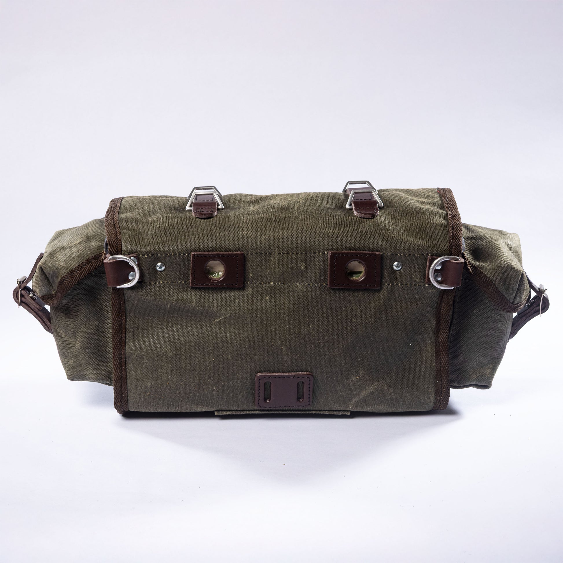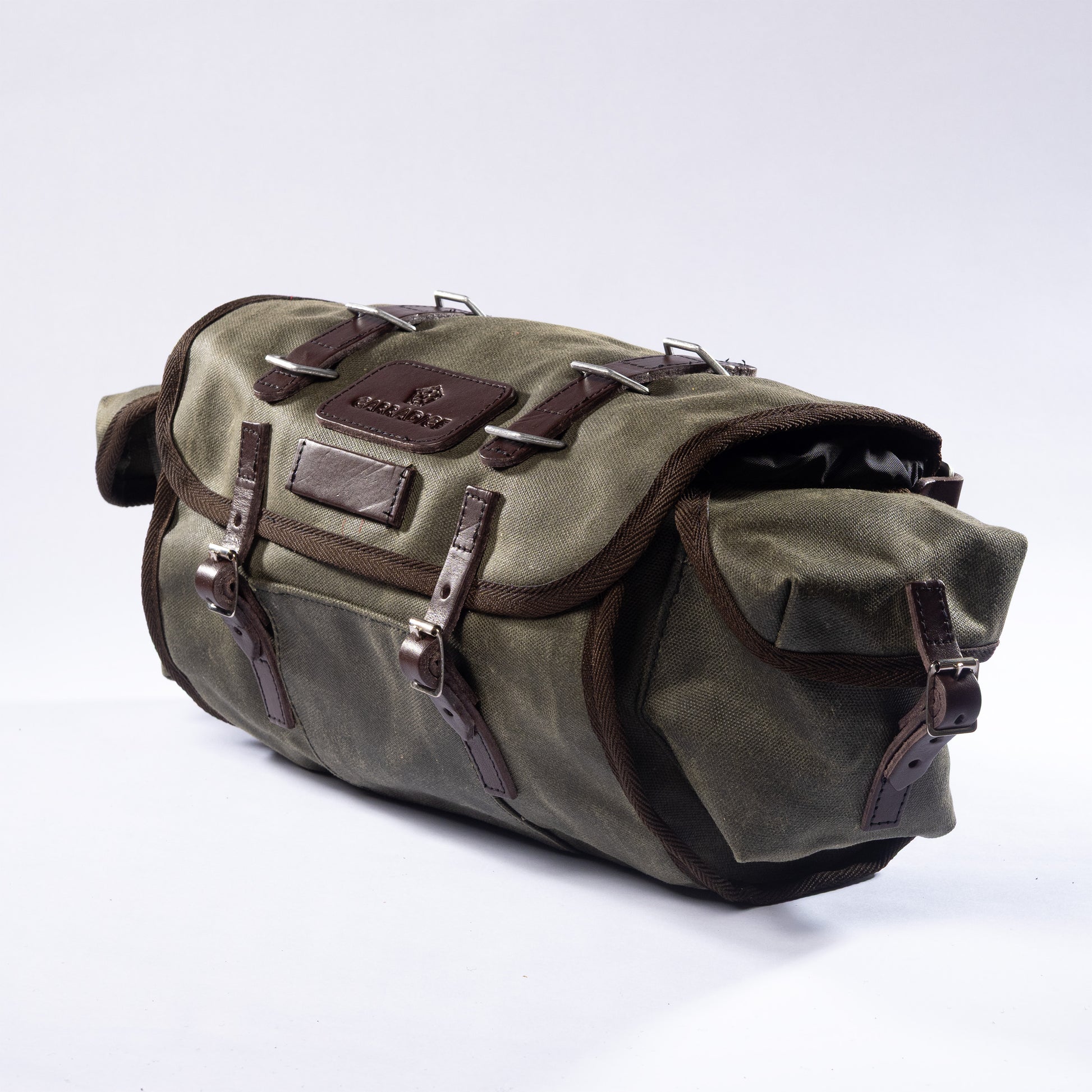 Made from 100% waterproof 18oz waxed cotton duck with self-sealing seams, it delivers reliable protection in mixed weather and off-road conditions. The fabric can be reproofed over time, ensuring long-term durability and sustainability. The Field Green finish is complemented by burgundy leather detailing and brown webbing for a refined, heritage-inspired look.