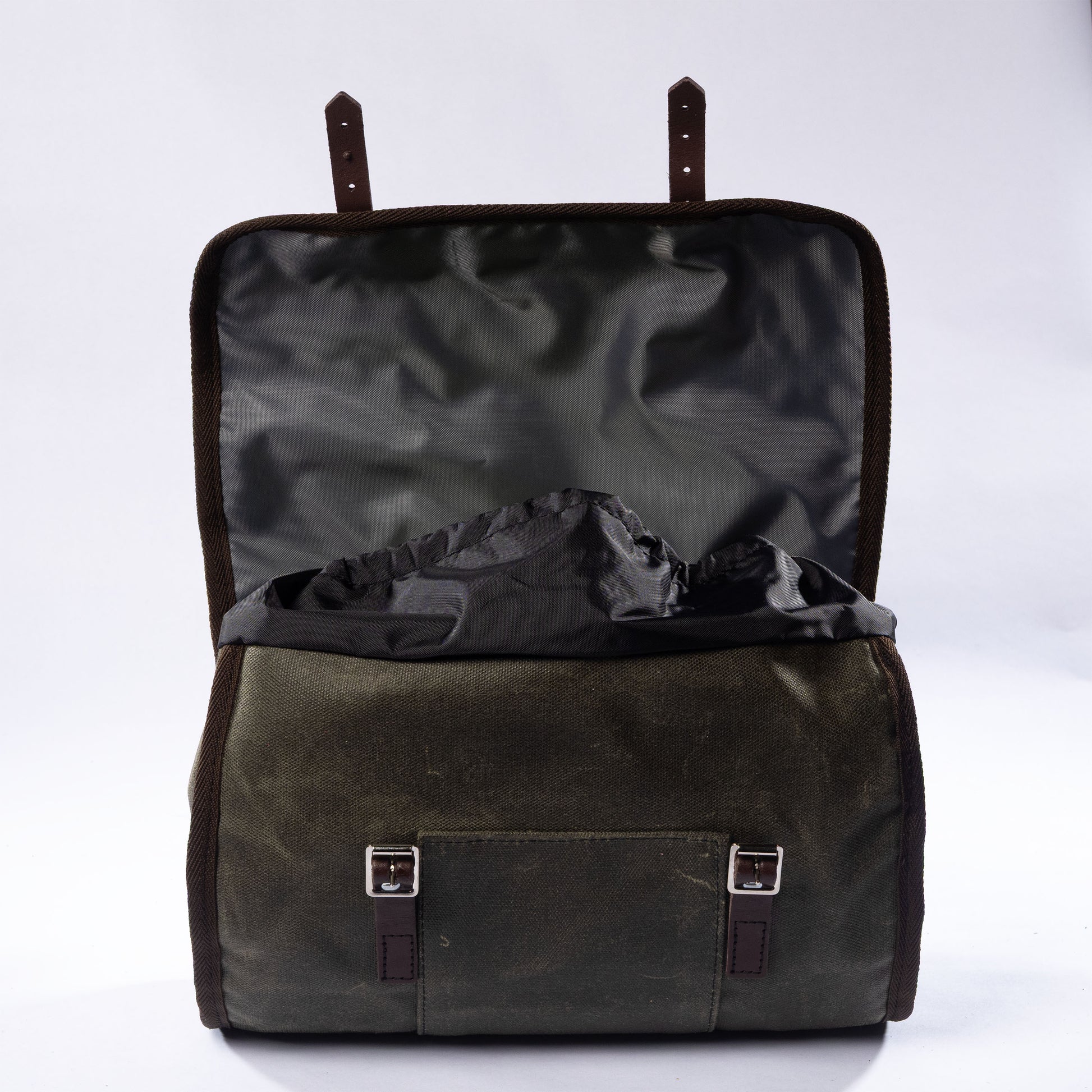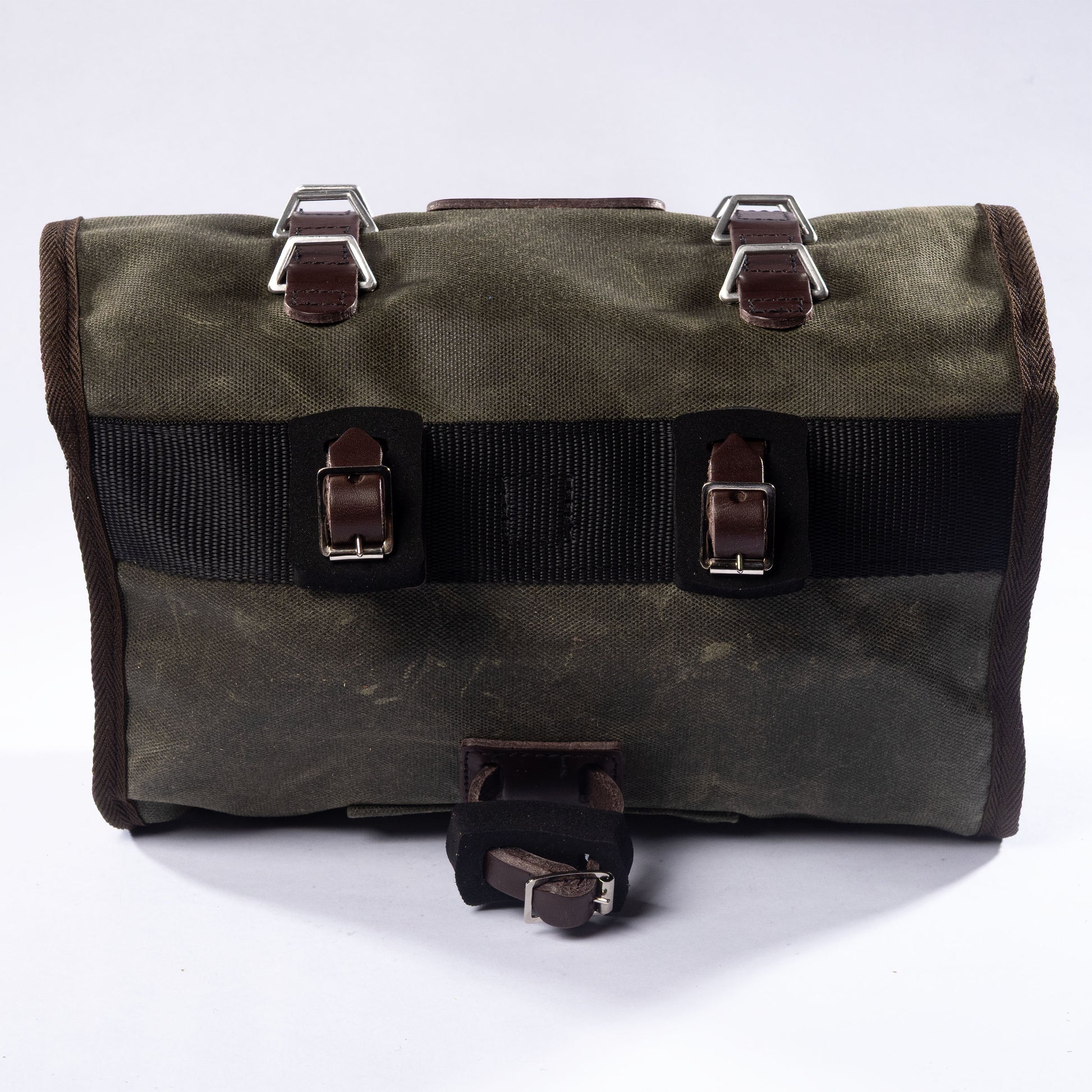 Constructed from 100% waterproof 18oz cotton duck, it delivers dependable weather protection and long-term durability. An internal support structure maintains shape and stability on rough surfaces, while leather binding reinforces high-wear areas. Finished in Field Green with burgundy leather detailing and brown webbing, it blends classic Carradice heritage with modern adventure styling.
